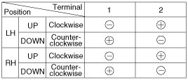 4. Connect the motor terminals directly to battery voltage (12V) and check that the motor operates smoothly. Next, reverse the polarity and check that the motor operates smoothly in the reverse direction. If the operation is abnormal, replace the motor.