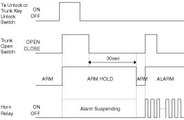 For the system to arm, the ignition switch must be off and the key removed. Then, the body control module must receive signals that the doors, hood, and trunk lid are closed and locked. When everything is closed and locked, none of the control unit inputs are grounded.