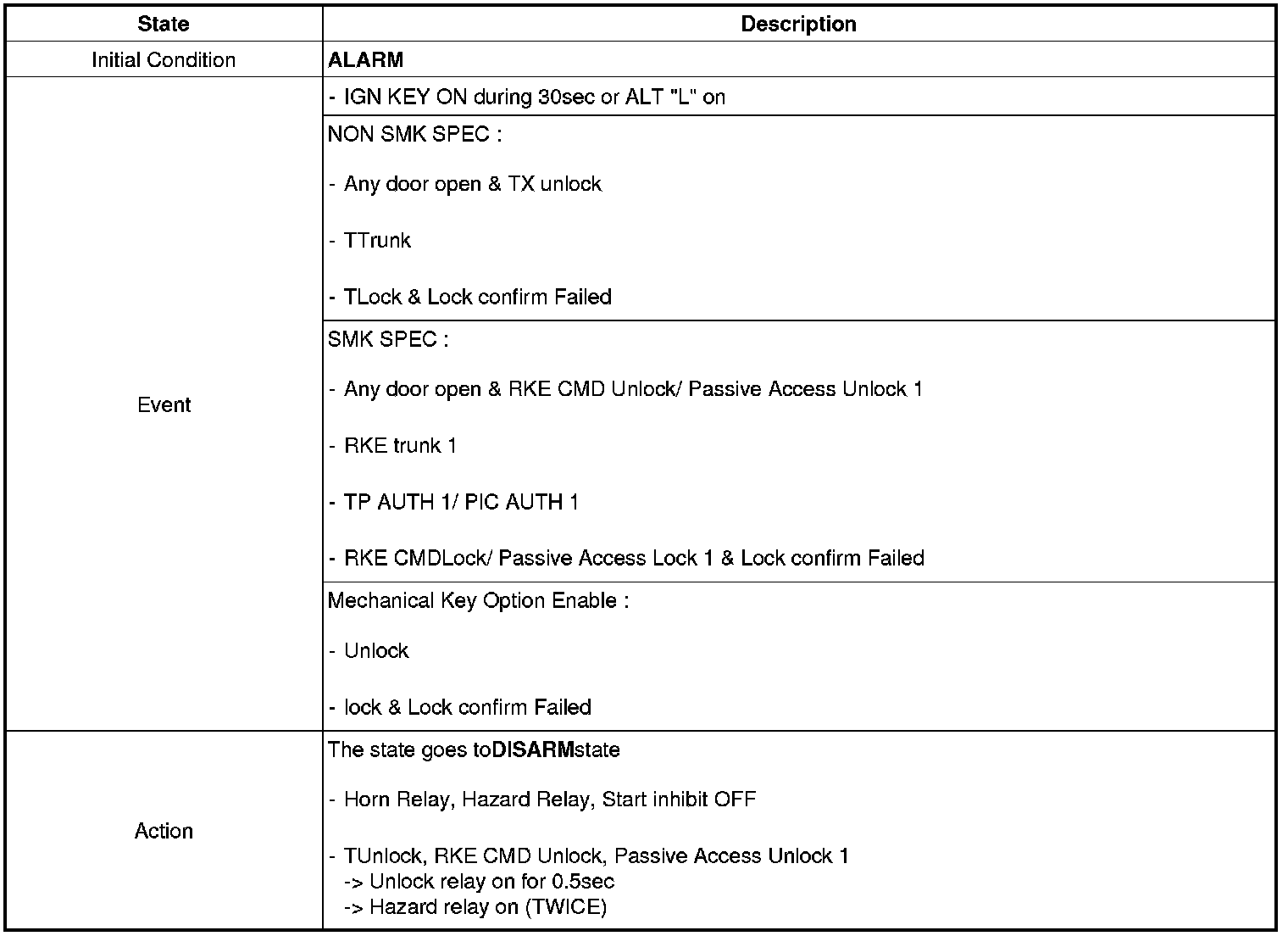 When the system is set off, the alarm (horn) sounds and the hazard lamp flash for about two minutes or until the system is disarmed by unlocking the transmitter.