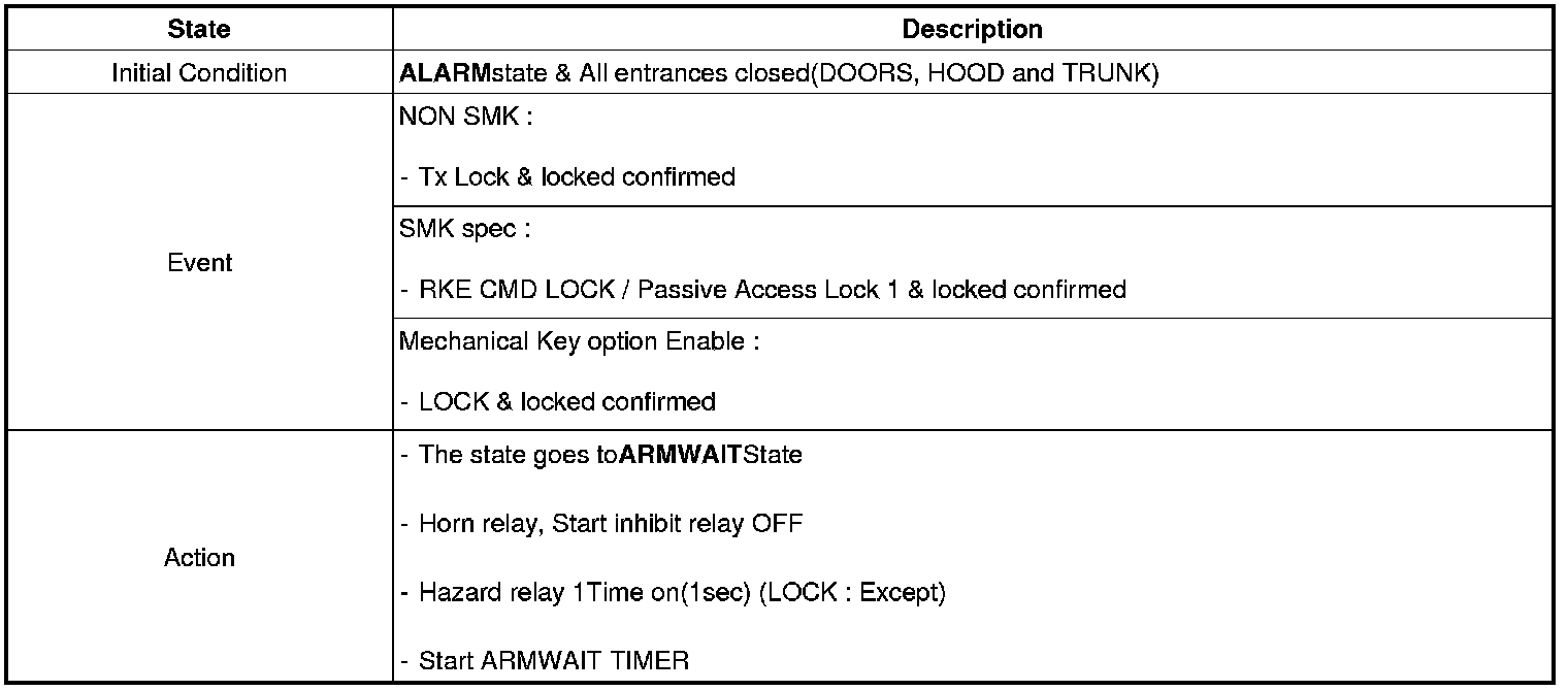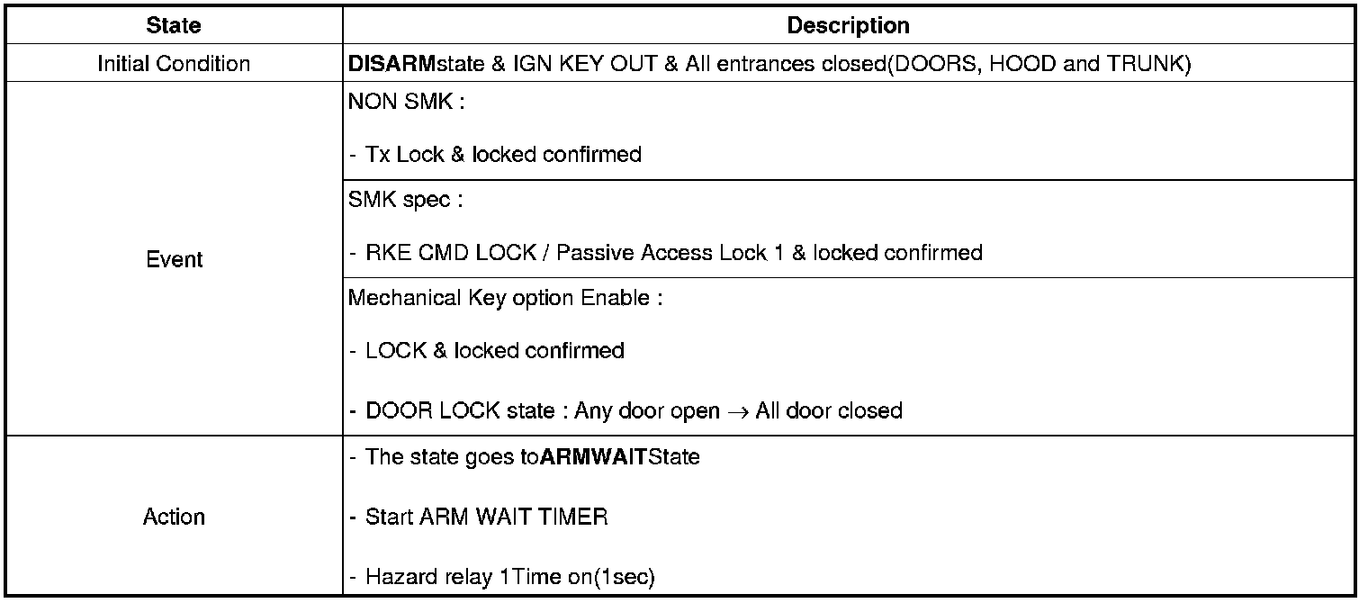 The door switches, hood switch and trunk lid switch are all close and lock the doors with the remote transmitter and then the system arms after 30 second.