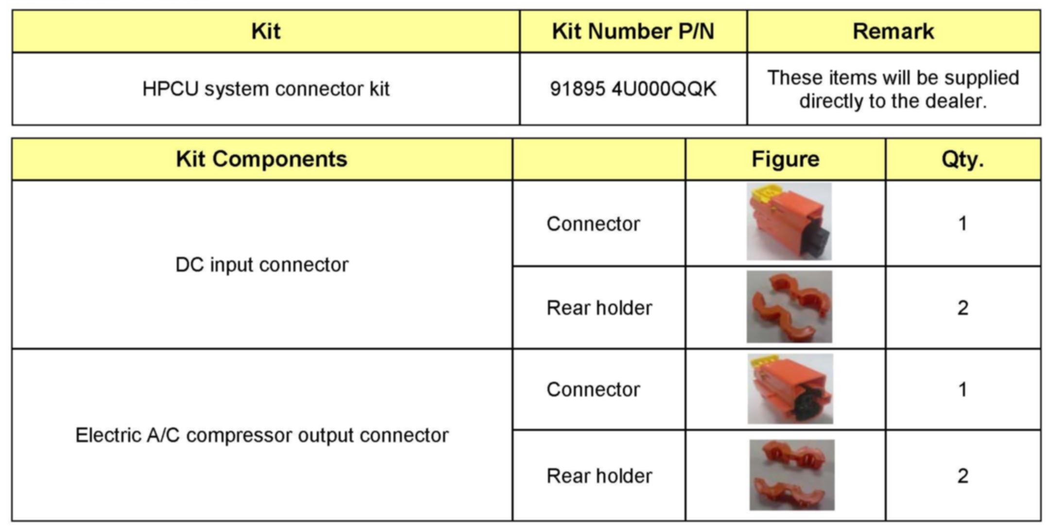 This bulletin provides the procedure to replace the HPCU (Hybrid Power Control Unit) input connector and A/C output connector with an improved version on Optima Hybrid vehicles produced from start of production to October 28, 2011. Kia is requesting the completion of this Service Action on all affected Optima Hybrid vehicles. Before conducting the procedure, verify that the vehicle is included in the list of the affected VINs.