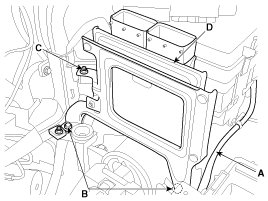 5. Remove the mounting bolts (B)/nut (C), and then remove the ECM (D).