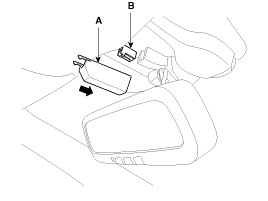 1. Push the inside rear view mirror base (A) down to remove the inside rear view mirror assembly (B).