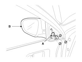 3. After loosening the mounting nuts, then remove the outside rear view mirror (B).