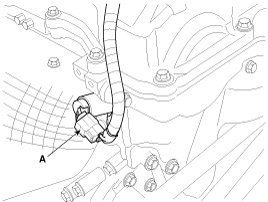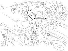 11. Disconnect PCSV (Purge control solenoid valve) connector (A) and loosen the vacuum & PCSV (Purge control solenoid valve) pipe assembly mounting bolts and nut.