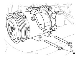 18. Remove the A/C compressor lower bolts (A).