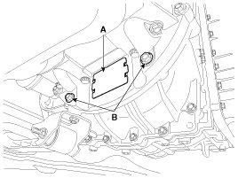 1. Remove the dust cover (A) on the bottom of the ladder frame and unfasten the two transaxle mounting bolts (B).