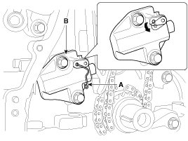 29. Release the ratchet by pulling the link down using a thin rod. Compress the piston and then insert a stopper pin (A) into the hole on the ratchet to hold the compressed piston. Remove the timing chain tensioner (B).