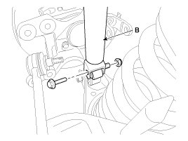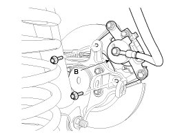 5. Remove the brake caliper mounting bolts , and then hold the brake caliper assembly (B) with wire as shown in the illustration.