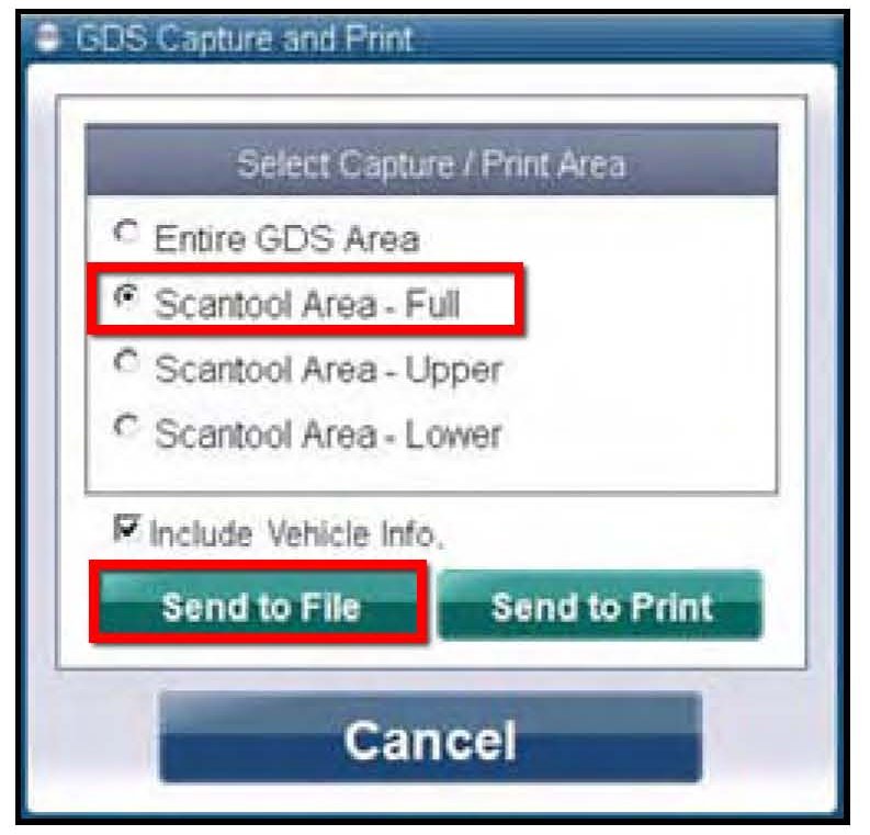 9. Select "Scantool Area - Full" and click "Send to file". The GDS will set up a designation folder and file name to save the captured data. Please change the file name to include the model/engine, the last 6 of the VIN and the date (mmddyyyy). Before saving, write down the file name and designation folder for further reference.