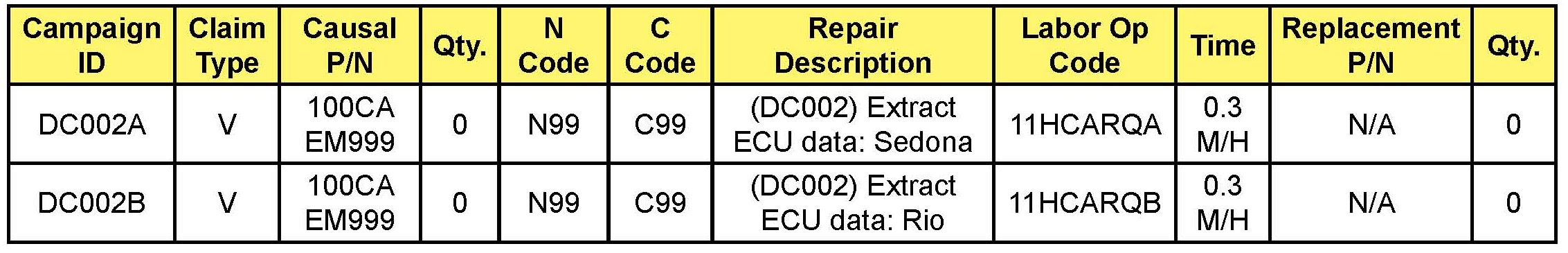 VIN inquiry data for this repair is provided for tracking purposes only. Kia retailers should reference DC002 when accessing the WebDCS system.