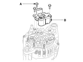 2. Loosen the mounting bolts (A) and disconnect the brush holder assembly (B).