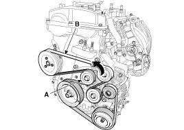 4. Remove the drive belt (B) after turning the drive belt tensioner (A) counterclockwise.