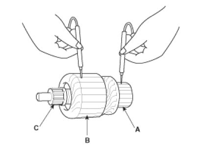 8. Check with an ohmmeter that no continuity exists between the commutator (A) and armature coil core (B), and between the commutator and armature shaft (C). If continuity exists, replace the armature.