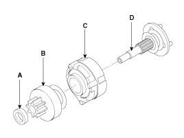 11. Disconnect the stopper (A), overrunning clutch (B), internal gear (C), planet shaft (or drive shaft) (D).