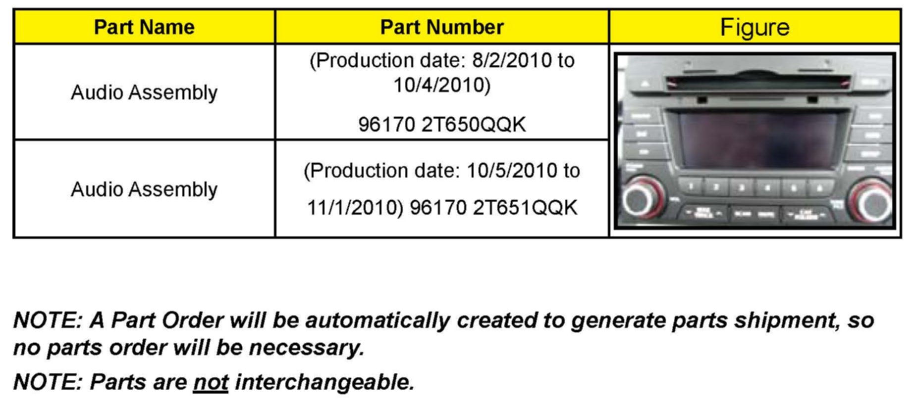This bulletin provides information regarding a possible audio unit concern on 2011MY Optima vehicles produced from start of production - 11/1/2010. The Audio unit may not operate properly or the LCD display may not function as designed. The inspection procedure outlined in this bulletin will assist in identifying this issue. To ensure maximum customer satisfaction Kia is requesting the completion of this Service Action on all affected 2011 MY Optima vehicles. Please perform this Service Action for all dealer in stock units prior to retail sales. Use the following procedure to inspect for the condition. It will be necessary to contact Techline prior to replacing an audio unit to confirm the condition and obtain release of a re-placement part.
