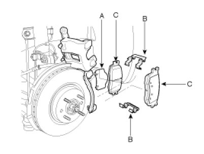 3. Install the brake pads (B) and pad shims (D) on the pad retainer correctly. Install the pad with the wear indicator (A) on the inside. If you are reusing the pads, always reinstall the brake pads in their original positions to prevent a momentary loss of braking efficiency.