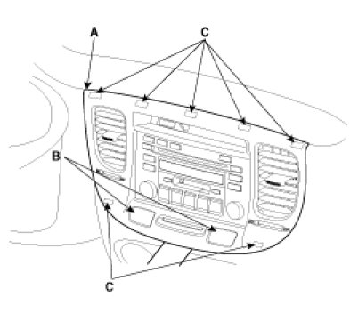 2. Remove the center facia upper panel (A) after pulling it by using regular screw driver (-). Take care of fixing clips (C).