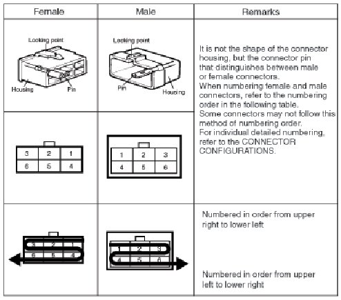 - It shows the front of the connector on the harness side when not to the harness connector. The terminal number on each connector can be obtained by following the pattern used in (5) connector view and numbering order. Unused terminals are marked with an asterisk (*).