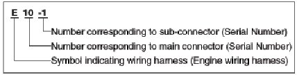 A connector identification symbol consists of a wiring harness location classification symbol corresponding to a wiring harness location and number corresponding to the connector.