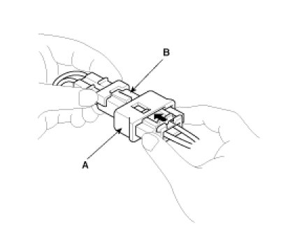 1. To reconnect, hold the pawl-side connector half, and press on the back of the sleeve-side connector half in the direction shown. As the two connector halves are pressed together, the sleeve (A) is pushed back by the pawl (C). Do not touch the sleeve.