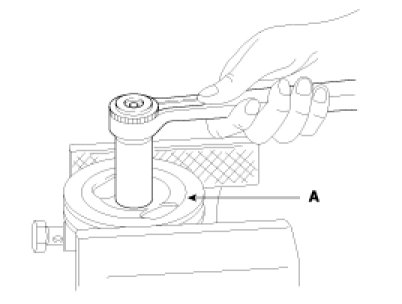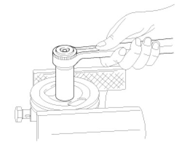 8. Mount the pulley in a vise and remove the pulley nut and the spring washer.
