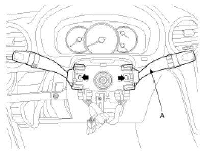 11. Remove the multifunction switches (A) from the steering column with the portion indicated by arrow pressed.