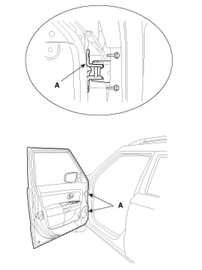 4. Grease the pivot portions of the hinges indicated by the arrows (A).