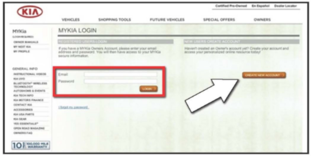 2. You will be navigated to the "MYKIA LOGIN page. Create a new user account (arrow) by following the prompts.
