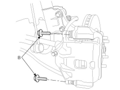2. Loosen the guide rod bolt (B) and pivot the caliper up out of the way.