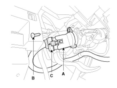 3. Remove the ignition switch (A) after loosening the screw (B) with IG ON and disconnecting the 6P connector (C).