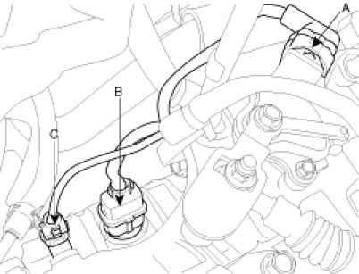 5. Disconnect the inhibitor switch connector (A), solenoid valve connector (B) and the input speed sensor connector (C).