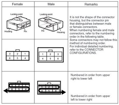 - It shows the front of the connector on the harness side when not to the harness connector. The terminal number on each connector can be obtained by following the pattern used in (5) connector view and numbering order. Unused terminals are marked with an asterisk (*).