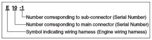 A Connector identification symbol consists of a wiring harness location classification symbol corresponding to a wiring harness location and number corresponding to the connector.