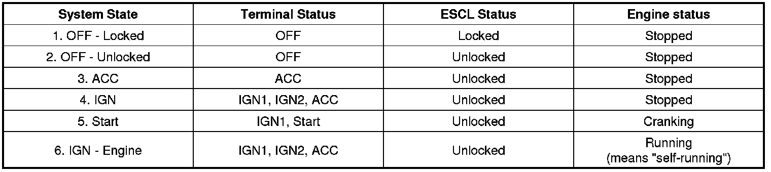 Referring to the terminals, the system states described in the table above are same as those one found in a system based on a mechanical ignition switch. The one of distinction with Mechanical-Ignition-Switch based system is that the BES system allows specific transition from [OFF] to [START] without going through [ACC] and [IGN] states.