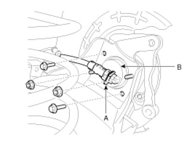 3. Remove the brake caliper mounting bolts (A), and then place the brake caliper assembly (B) with wire as shown in the illustration.