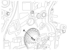 3. Set the crankshaft so that the key (A) of crankshaft will be aligned with the mating surface of main bearing cap. Put the intake and exhaust camshaft assembly so that the TDC marks (B) of the intake and exhaust CVVT sprockets will be aligned with the top surface of cylinder head. As a result of this, the piston of No.1 cylinder is placed at the top dead center on compression stroke.