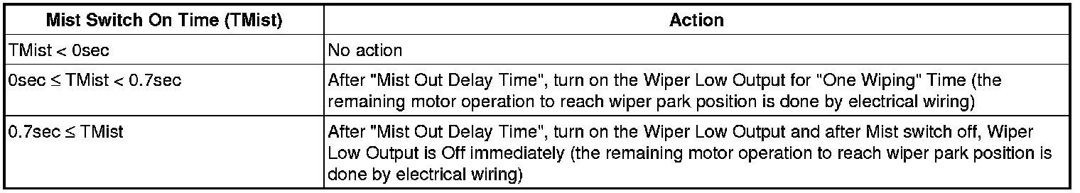 In case of IGN2 On (IGN2 ON), if turning on the Wiper Mist switch(Wiper Mist switch On), then Wiper is controlled, by switch on time. Mist operation does not work at Wiper Washer.