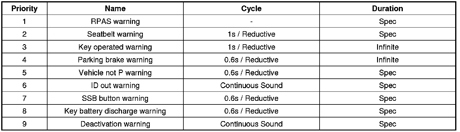 1. From IGN1 switch ON, Warning lamp for 1sec(DUTY 50%) and Chime buzzer for 6 time every 1sec. (in case of S/BELT unfastened state) But, within 6sec in the S/BELT fastened, the Chime buzzer output is stop, and Warning lamp is the remaining time.