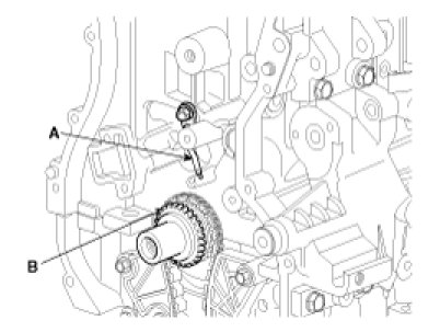 2. Install the crankshaft chain sprocket (B) and the timing chain oil jet (A).