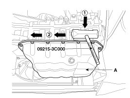 - Insert the SST between the oil pan and the ladder frame by tapping it with a plastic hammer in the direction of 1 arrow.