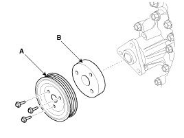 21. Remove the water pump pulley (A) and the dust cover (B).