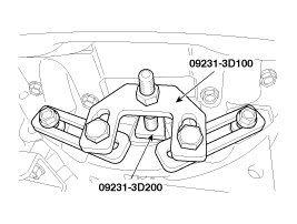 5. Install the SST (09231-3D100, 09231-3D200) using the two transaxle mounting bolts and spacers. Tighten the bolts and nuts of the holder and links securely.