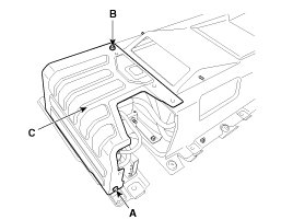 2. Unfasten bolt (A) and nut (B) and then remove the rear cover of the high voltage battery (C).
