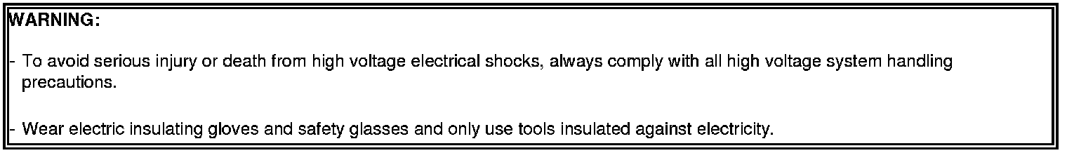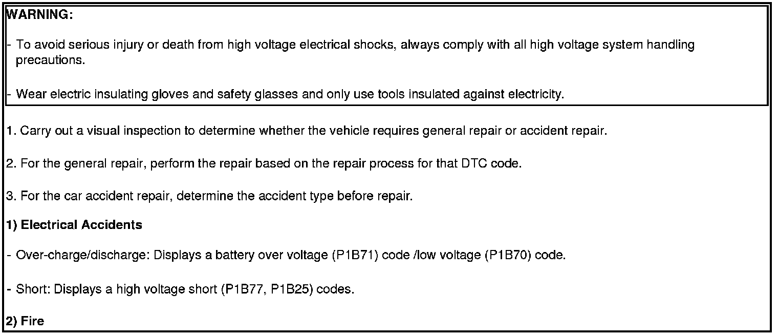 To avoid serious injury or death from high voltage electrical shocks, shut off the high voltage circuit before doing any work related with the high voltage system (Battery Pack Assembly, Power Relay Assembly, HPCU, BMS ECU, Hybrid Drive Motor, Inverter, HSG, LDC Power Cable, Electric Compressor, and so on).