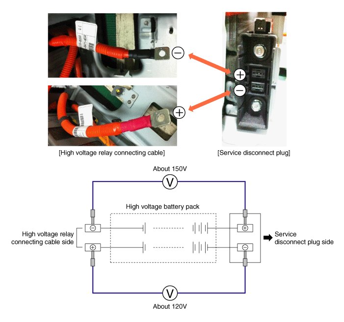 If the measured voltage is more than 30V, check the removal of the service disconnect plug again.