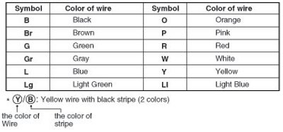 The following abbreviations are used to identify wire colors in the circuit schematics.