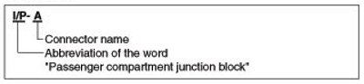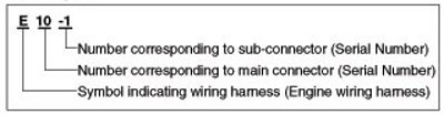 A Connector identification symbol consists of a wiring harness location classification symbol corresponding to a wiring harness location and number corresponding to the connector.