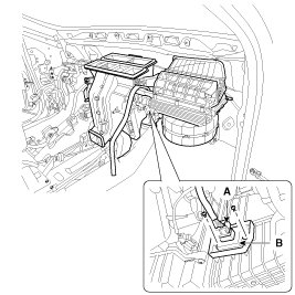 3. Disconnect the blower resistor connector (A) and then remove the blower resistor (B) after loosening the mounting screws.