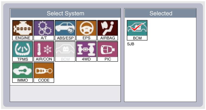 2. To diagnose the SJB function, select the vehicle model, BCM and SJB.